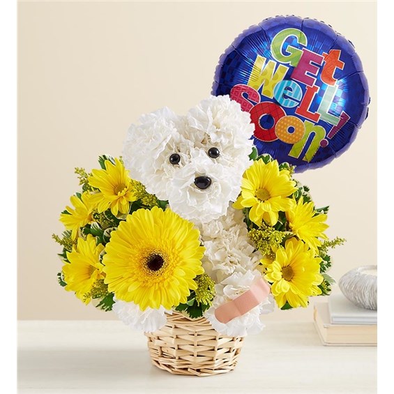 Our truly original flower pup is the best pick-me-up for anyone under the weather. Handcrafted with white blooms and yellow accents, this adorable creation will have them on the mend in no time. Add a colorful Get Well balloon for happy healing wishes.